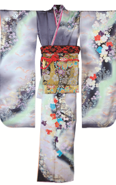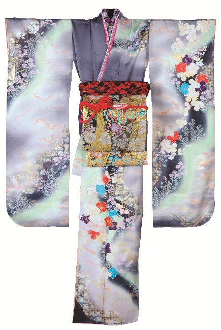 振袖にグレーの地色が入っているので、シルバーグレーの格調高い古典の帯を合わせてみました。