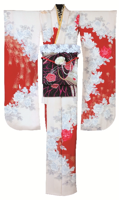 洋柄のインパクトのある柄の振袖に洋柄のバラ柄の帯を合わせてみました。
