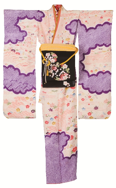 素敵な絞り柄の振袖に桜柄の黒字の帯でスッキリ引き締まるようにしました。